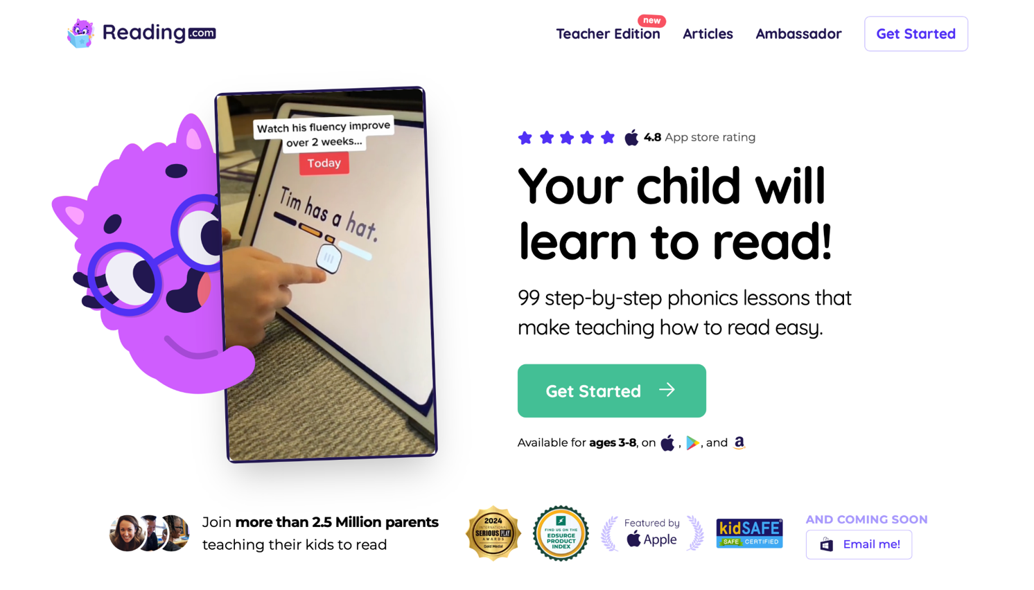 Reading.com guides children through structured phonics lessons that feel collaborative and supportive, with clear steps that parents and kids can follow together. The app breaks down letter sounds, blending, and early word recognition into short, manageable sessions that build steadily toward confident reading. Young learners work through interactive exercises that combine visuals, audio support, and simple stories, helping them connect sounds to meaning in practical ways.