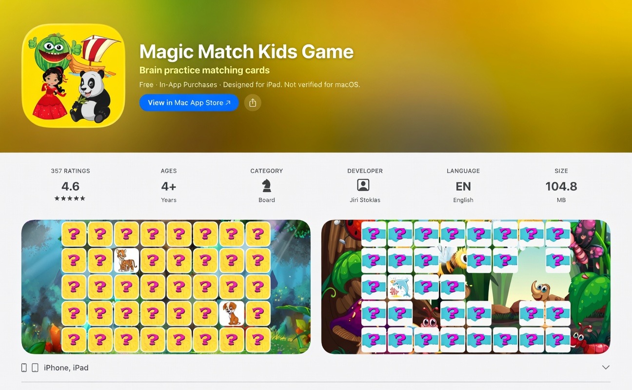 Progress indicators give parents a quick view of improvement over time which provides reassurance that the time spent playing is making a difference. The app serves as an easy entry point for families new to memory activities who want something simple yet effective to start with. The minimal design makes navigation intuitive even for toddlers who are still learning how touch screens work and the gentle pacing prevents overwhelm during early attempts. Children gain confidence with each successful match which carries over into other areas of play and learning throughout the day.